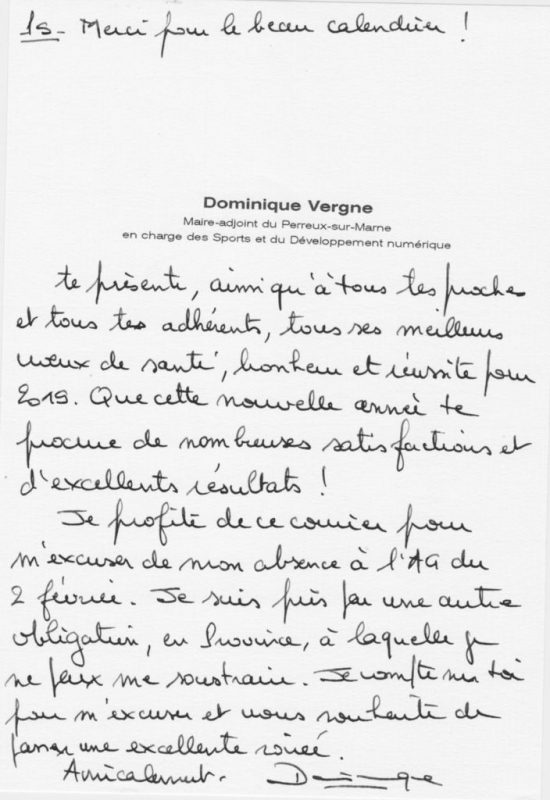 Les voeux de Dominique Vergne, Maire Adjoint chargé des sports au Perreux. Dominique Vergne 4 janvier 2019 Route 0 Commentaire …ravi de son calendrier des filles et dépité de ne pouvoir se joindre à notre AG.