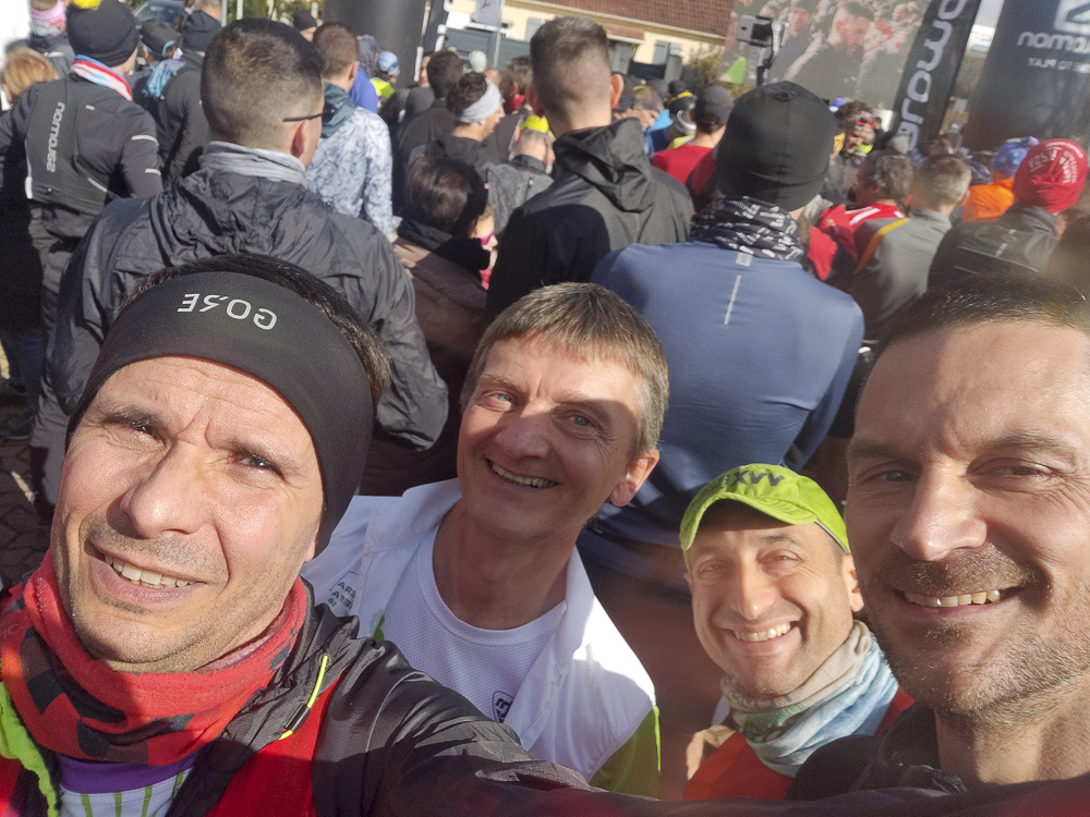 Retrait des dossards et direction la salle qui allait accueillir tous les coureurs, bien évidemment, nous nous regroupons, chacun son siège, ses provisions, son matériel … Zut … j’ai oublié mon coupe-vent … 2ième signe … merci Nicolas de m’avoir dépanné !