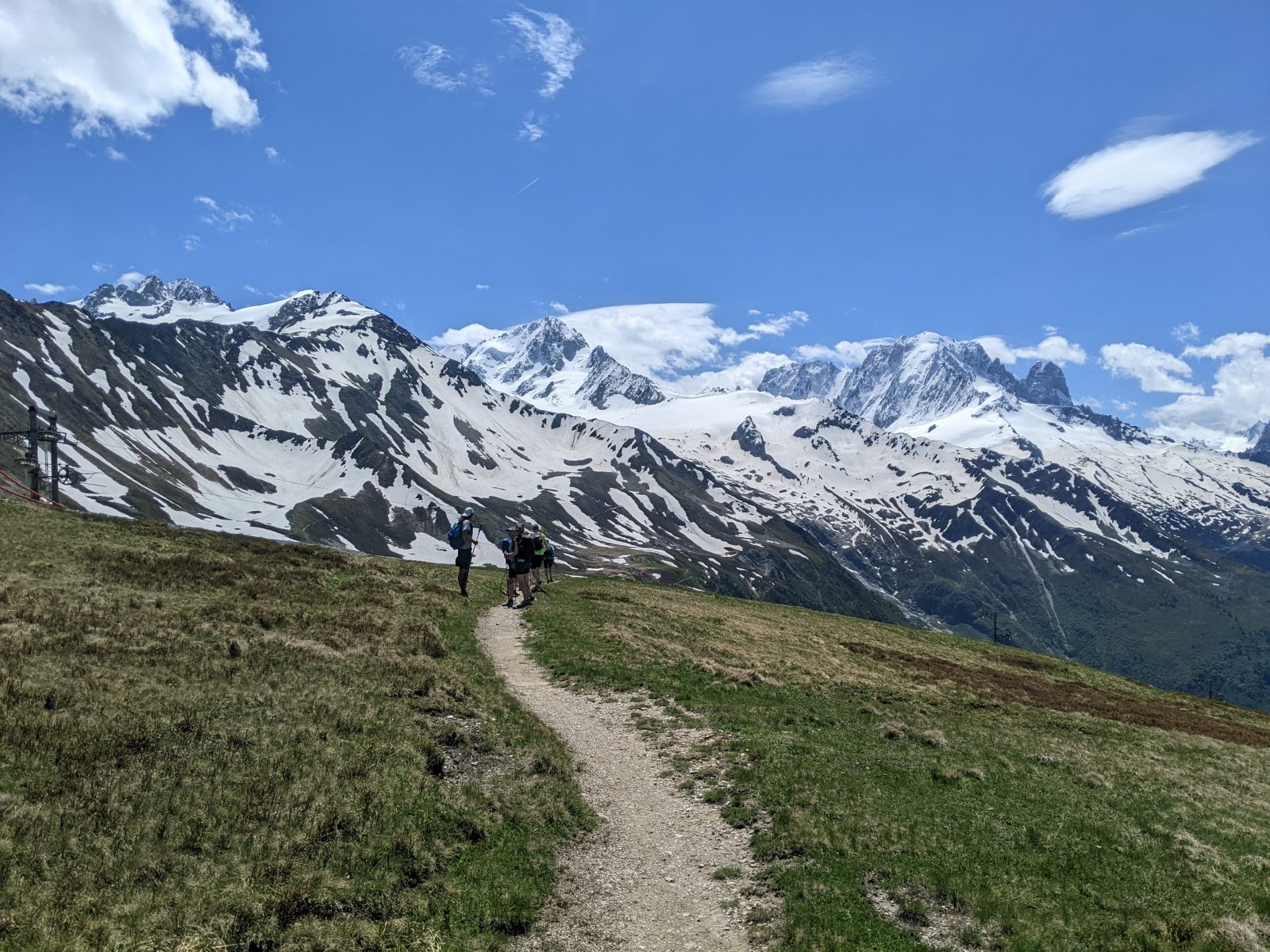 La descente vers le col de la Forclaz sur un sentier en sous-bois est un régal pour les jambes. Arrivés à Trient, plutôt que de prendre le sentier qui longe la route pour Vallorcine, nous prenons le sentier qui nous emmène à Catogne. Cette fois-ci ce ne sont pas des névés que nous devons traverser en mode stress mais des éboulis. Faut bien avouer que nous étions prévenus par une petite pancarte. Arrivés à Catogne, plutôt que de basculer sur le versant Français vers Vallorcine, nous rajoutons un peu de D+ en passant près du col des posettes et au pied de la tête de Balme, ça n’aide pas à destresser. Nous réalisons que la descente de Vallorcine n’est pas possible et nous filons vers le Tour pour attraper le train à Montroc, il est 13h40, les poursuivants attrapent celui de 14h10. Il nous restera une petite heure pour nous changer et casser la croute sur le quai de la gare des Houches, point de départ du retour sur Paris et Toulouse.