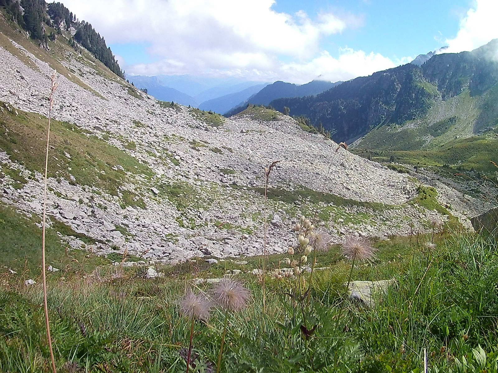 On prend le rythme de ma sœur bien sur, le but étant de s’arrêter le moins possible. Première montée, dans la forêt. Deuxième montée, la végétation se fait rare. Et on arrive dans les cailloux qui font la réputation de Belledonne!