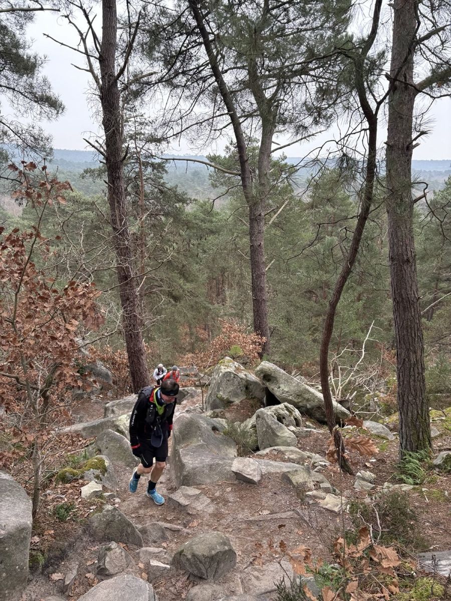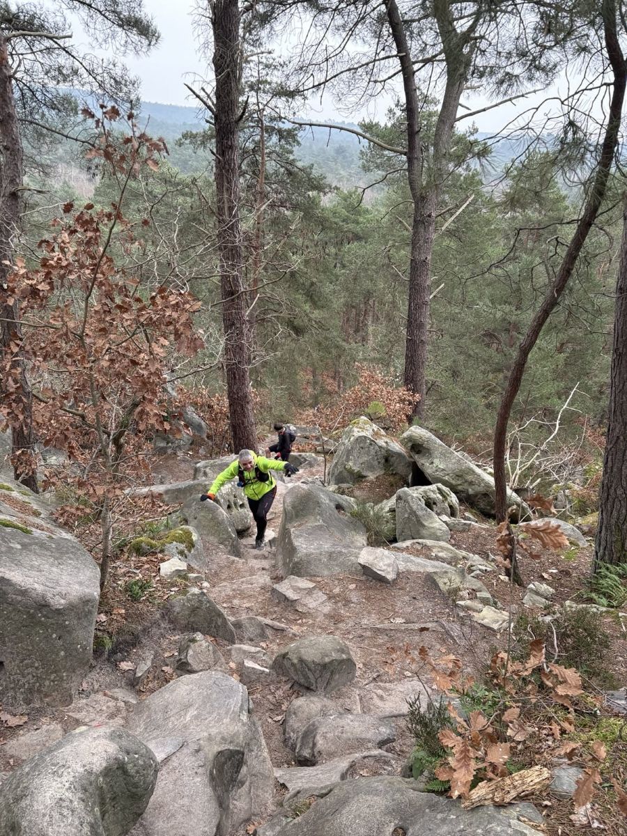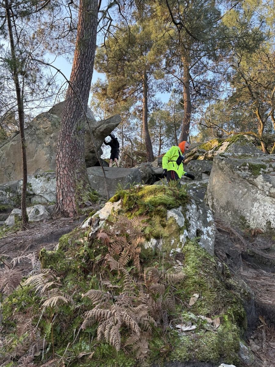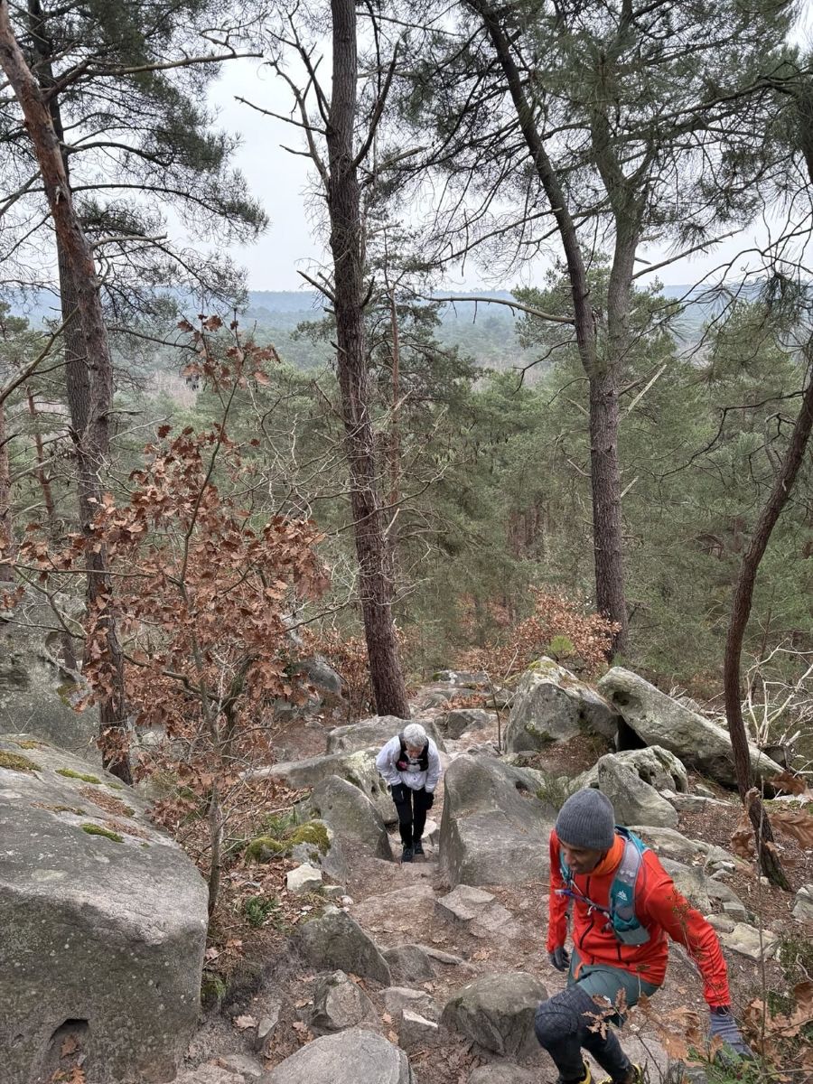 Guillaume propose une sortie à Fontainebleau sur le parcours des 25 bosses (16 km D+ 800) en mode TRANQUILLOU. Excellent ! Aïe, c’est le 27 décembre. Je pars le lendemain à la montagne, du coup j’hésite, par peur d’une chute compromettant mes vacances.