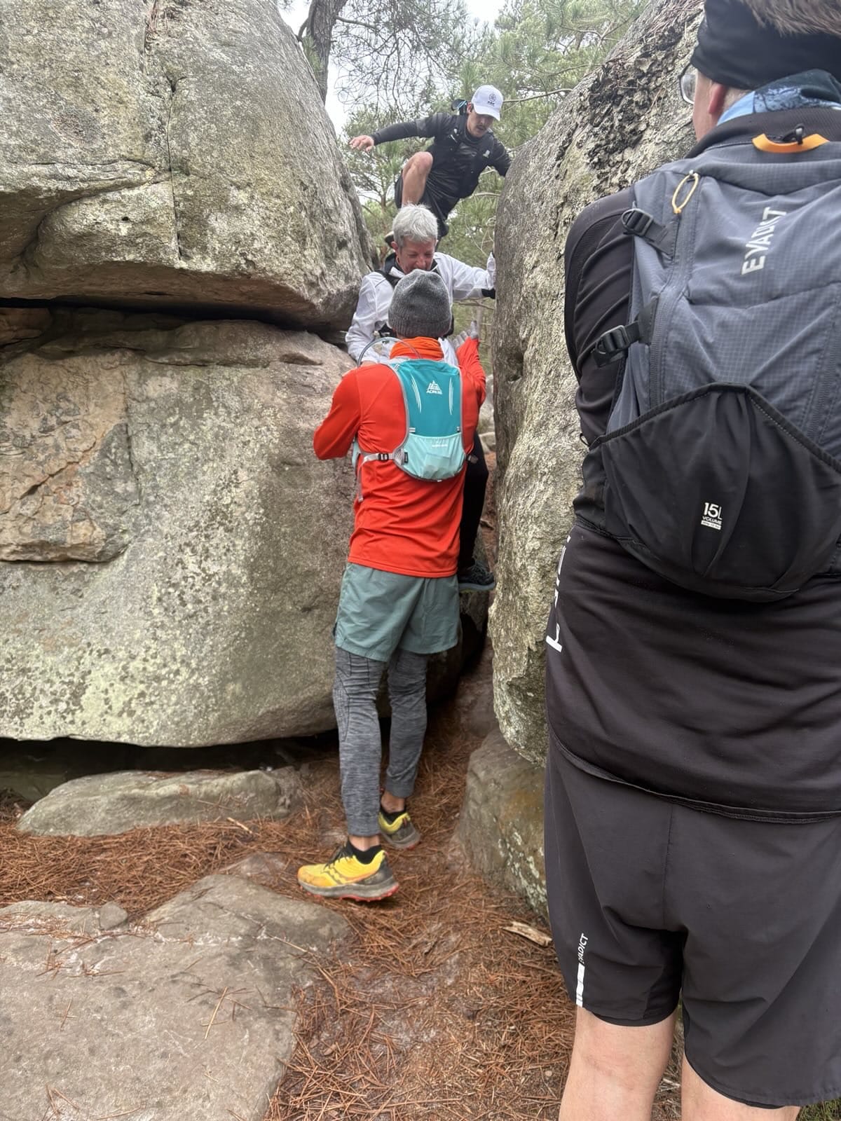 Les bosses arrivent vite. Ce sont de gros rochers, à escalader en posant les mains, à descendre sur les fesses ou non, à contourner. Alors là, les fentes et les squats du mardi soir, je vois bien leur utilité ! J’essaie de retenir et appliquer les conseils dispensés par Ismaël (pied gauche, pied droit, roche, …).