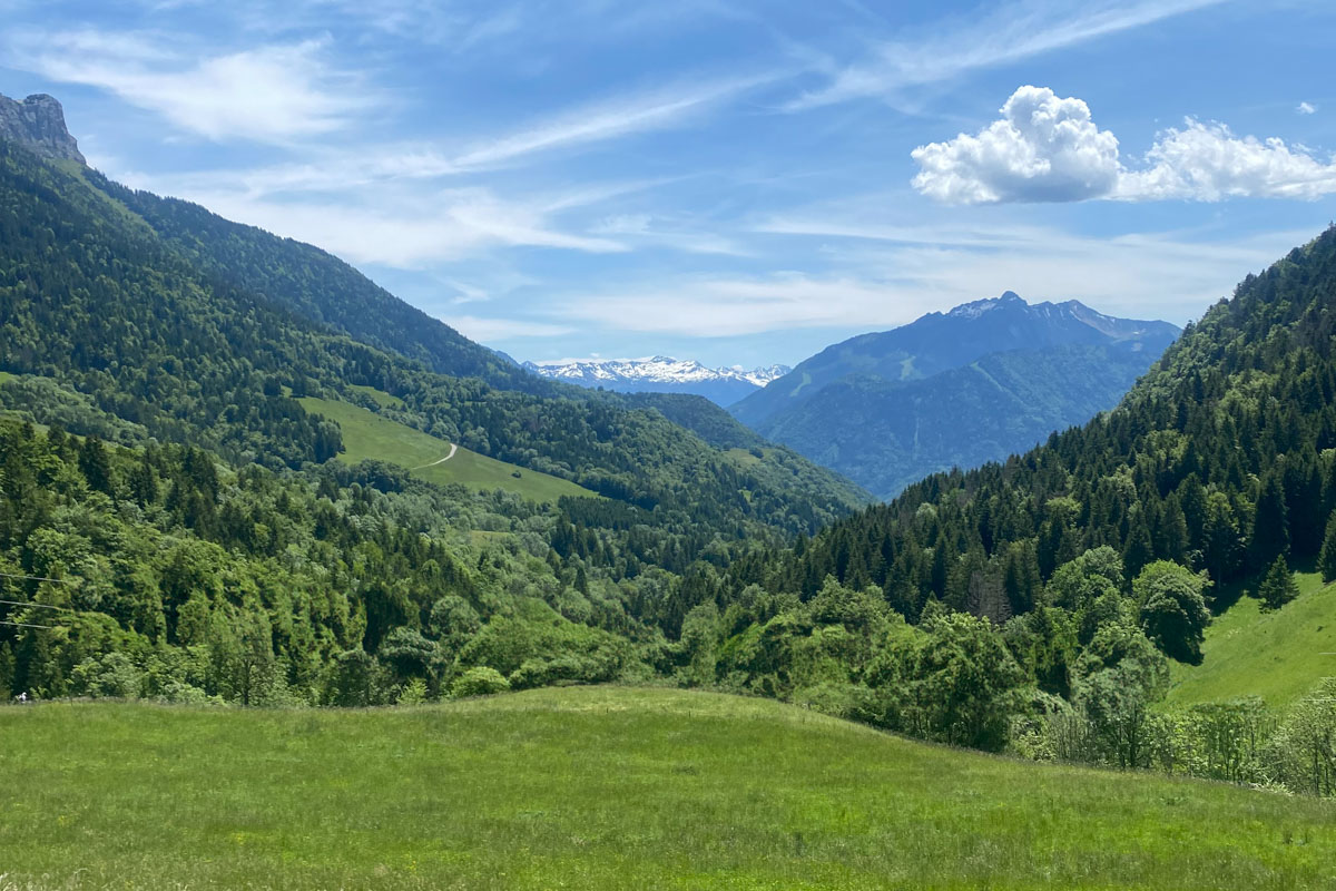 C’est l’heure de la première descente, plus technique que le V de gravelle mais cela permet de descendre correctement (Merci Olivier pour l’an dernier et ces entraînements à descendre les yeux fermés… ça aide !). Je suis plutôt à l’aise, mais je suis encore dérangé, la chaleur arrive, les questions sur la poursuite sont bien présentes. Je file vers le point d’eau pour remplir les flasques car il fait chaud, bingo une des flasques dans ma poche kangourou s’est ouverte y’en a partout ça colle et ça fait des morceaux (troisième erreur). Le moral continue de plonger, mais Nicolas est parti devant et on a dit que l’on ferait le point après le Col de la Cochette, bah je peux vous dire que celui-là il n’est pas drôle ni à monter ni à descendre. J’ai besoin de souffler en descente et de me poser, je sais que sinon je n’irai pas plus loin, je prends mon temps, je m’alimente et fait le vide avec cette vue magnifique. On essaye d’inverser la spirale négative qui me pousse à arrêter.