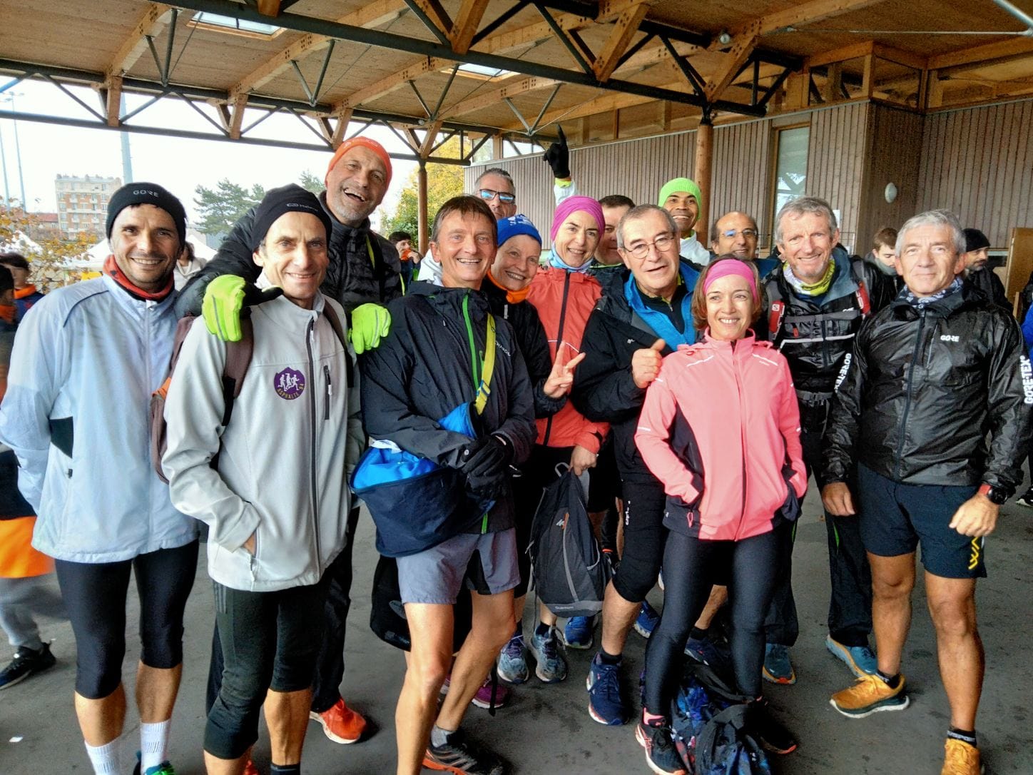 Les participants de l’Asphalte se retrouvent au fur et à mesure des arrivées, ça ne va pas être facile de faire la photo de groupe avec 44 inscrits du club sur ces deux courses. On profite de se retrouver à une vingtaine pour prendre une première photo