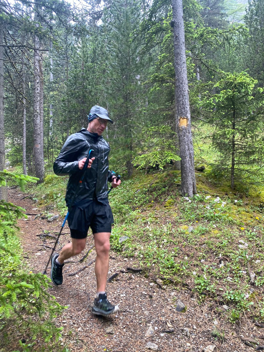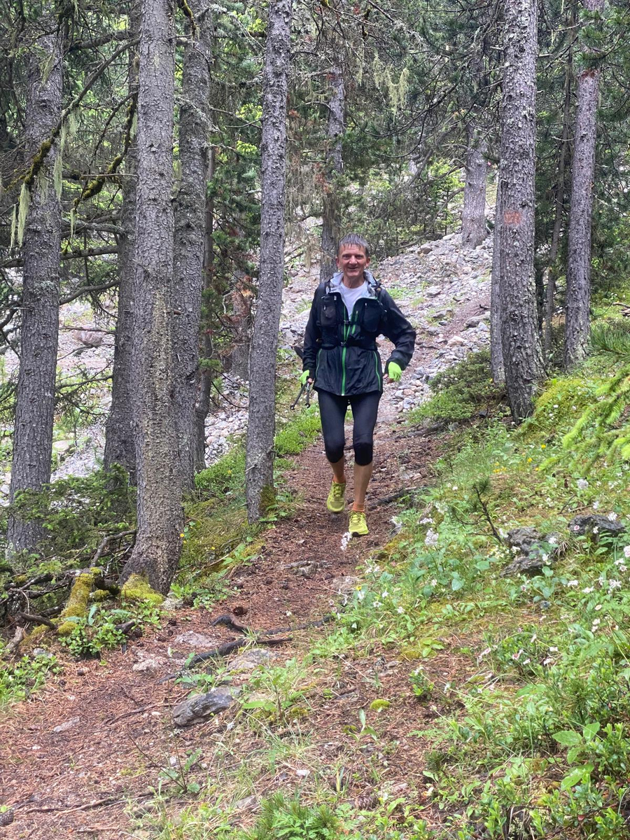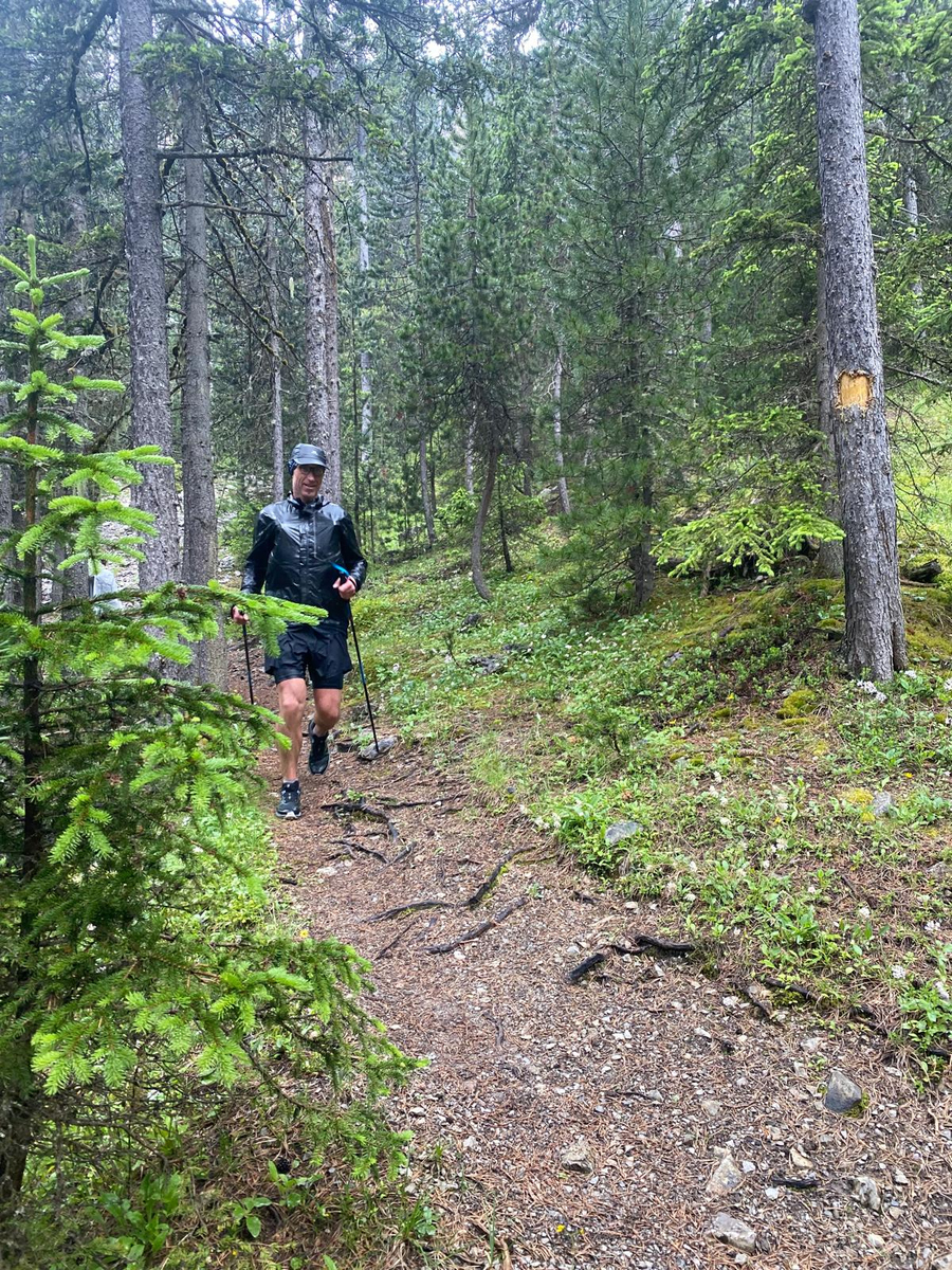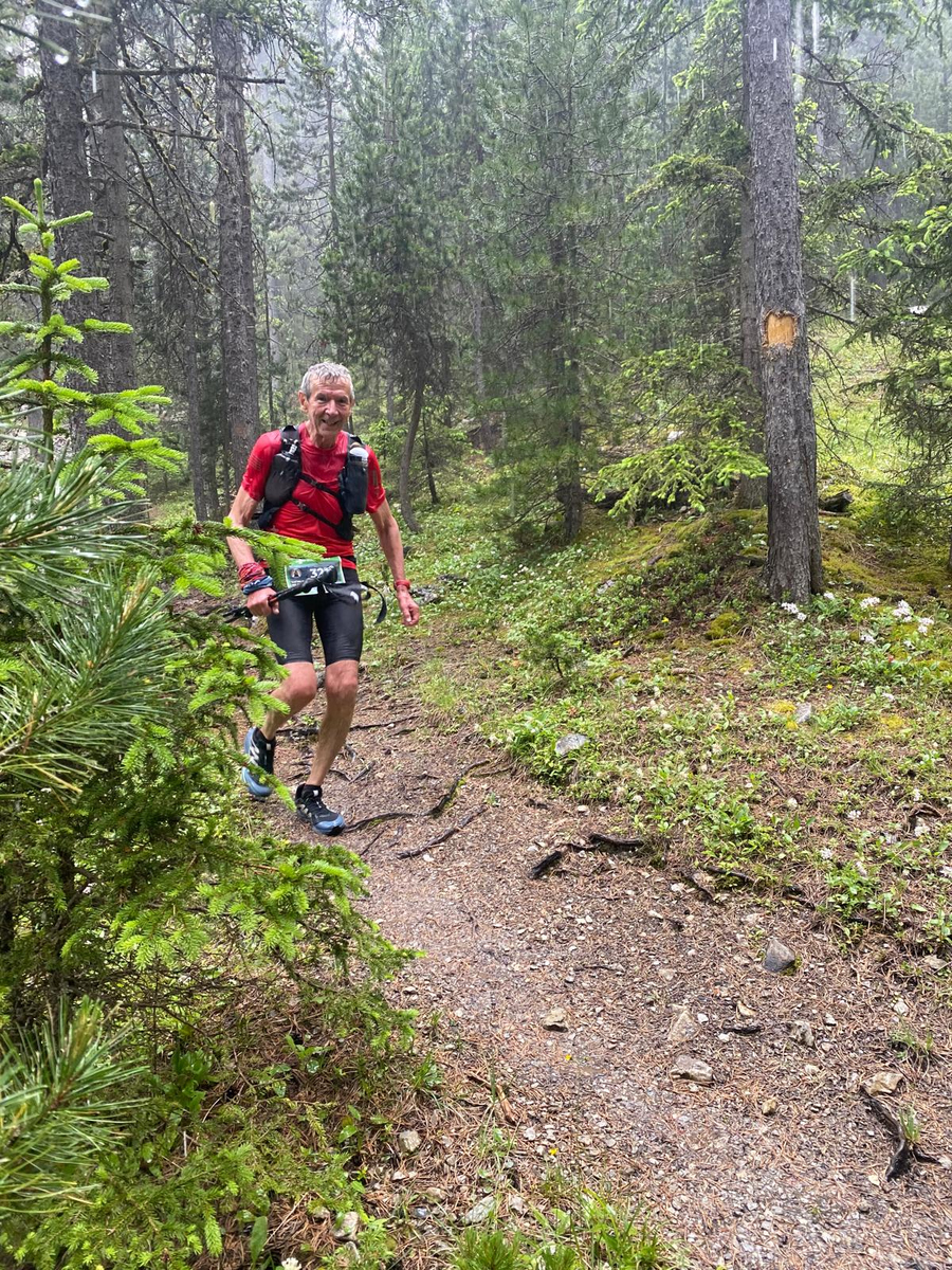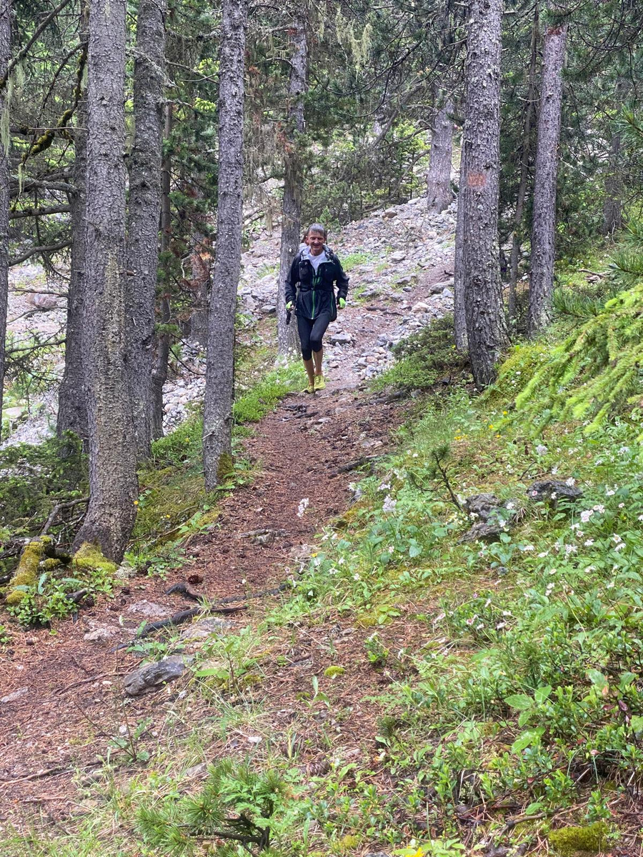 Le temps est parfait et le paysage est magnifique. Les conifères se reflètent sur le lac Miroir, et le lac Saint-Anne arbore un bleu turquoise éclatant. À 2 km du sommet, une grosse averse rend la descente glissante à travers les névés. C’est l’aventure. Le soleil revient doucement et je suis heureuse de faire ce trail. Je fais une pause au ravitaillement après une belle chute (rien de cassé, juste un peu sonnée). Michel arrive, c’est super, je l’attends pour qu’on reparte ensemble.