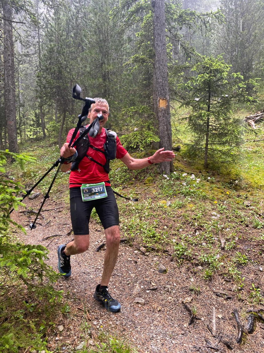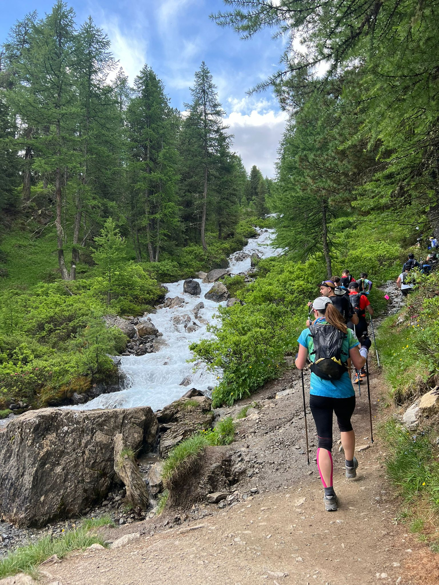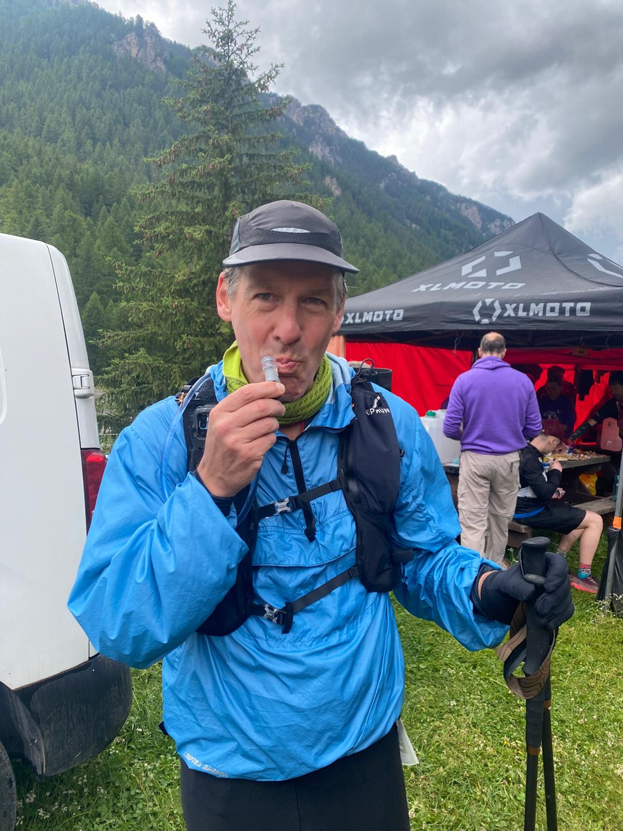 Toujours en forme, tout va bien. Michel me dit d’avancer sans lui. La montée me paraît alors interminable. À 2 km du deuxième col, c’est le même scénario. Non, pardon en pire… La grêle me fouette les genoux et le visage, c’est un enfer. La deuxième fois, ce n’est plus amusant. Je veux arrêter au prochain ravitaillement car si le troisième col est pareil, ce ne sera plus du plaisir. Allez, maintenant c’est maintenant l’orage. Ça glisse, je suis trempée, il faut que ça cesse. Vraiment, ce n’est plus possible. Finalement, durant la descente, le beau temps revient : le ciel et mon esprit s’éclairent. J’oublie très vite que je voulais abandonner. Soleils additionnels : ma mère, Philippe Doublet et sa femme sont là dans la vallée.