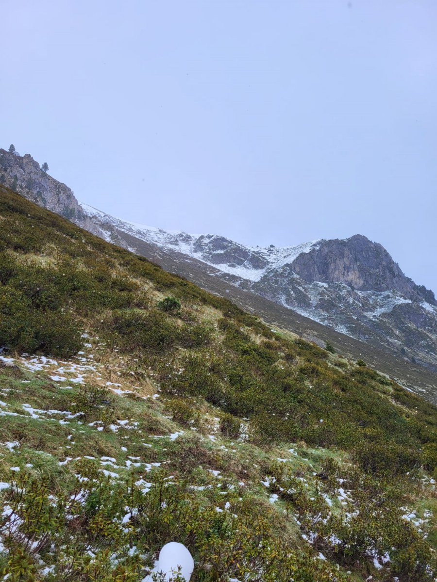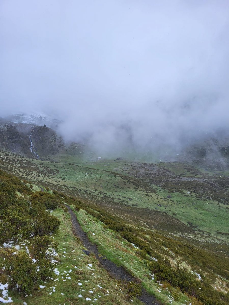 Froid oblige, on retourne au gite pour le déjeuner… Mais pas facile de repartir ! Certains sont restés se reposer, quand d’autres, décidés à voir de la neige, repartent en voiture pour prendre de la hauteur (et merci à Alexandre qui nous a permis d’y aller en conduisant une partie du groupe là haut !). Là, menés par Farid et Jules, on a pris l’assaut de la montagne, et à force de grimper à travers la brume nous arrivons à la cabane Auloueilh, surplombant un torrent sinueux à travers un haut plateau. Puis le groupe se sépare en deux, certains redescendent, et d’autres décident de continuer pour monter encore un peu plus, et finalement marcher sous la neige : on n’a pas été déçus ! Les nuages ont bien voulu se dégager quelques instants pour que l’on puisse quand même admirer la vue. La redescente en revanche était un peu trop fraîche à notre goût (et une petite pensée pour Morena qui a perdu un genou au combat).